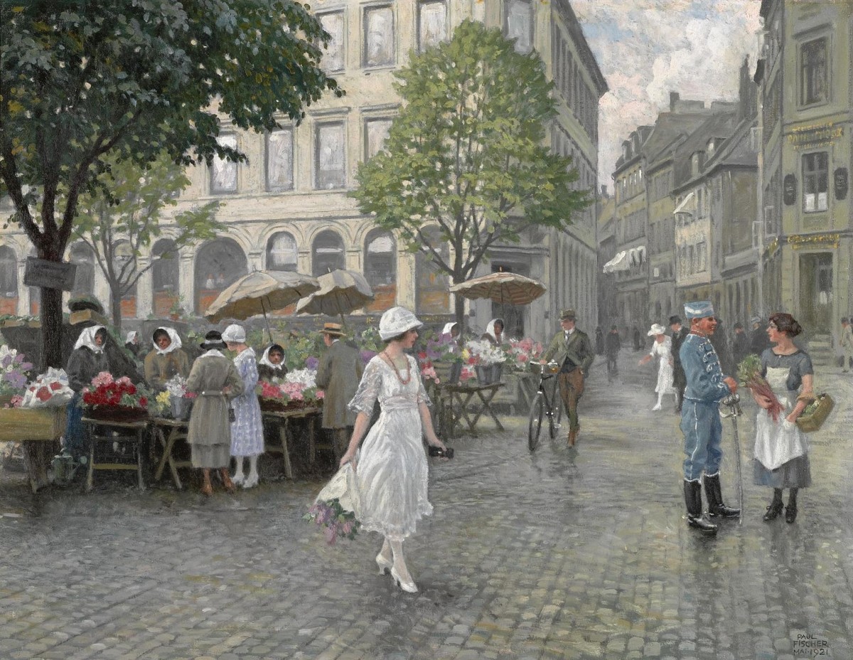 Автор - датский художник Paul Gustave Fischer (1860–1934). На картине изображена площадь Копенгагена (Дания) с цветочным рынком, девушка с букетом сирени переходит улицуОднотонные области: 0%