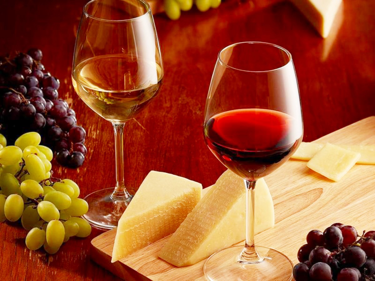 Два бокала с вином, сыр и виноград.