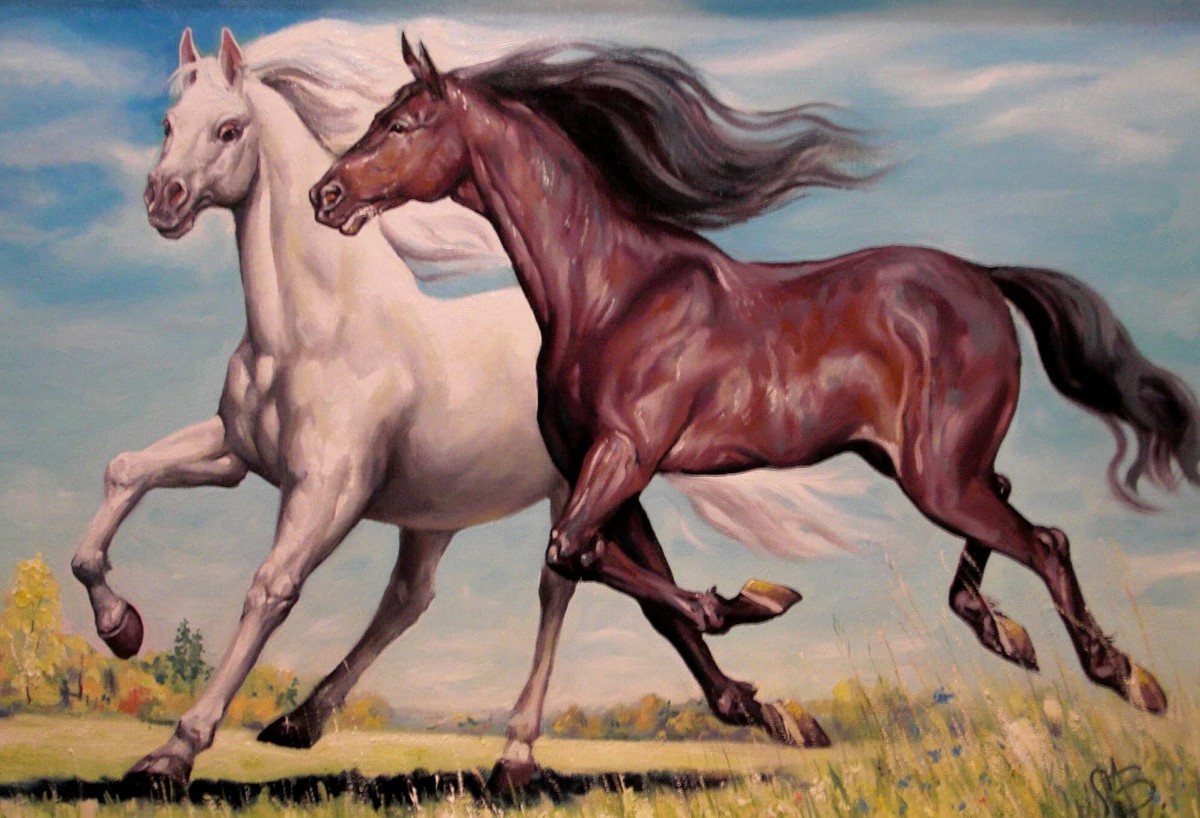 Две лошади бегут по полю. Художник Мануилов Виктор Львович.
