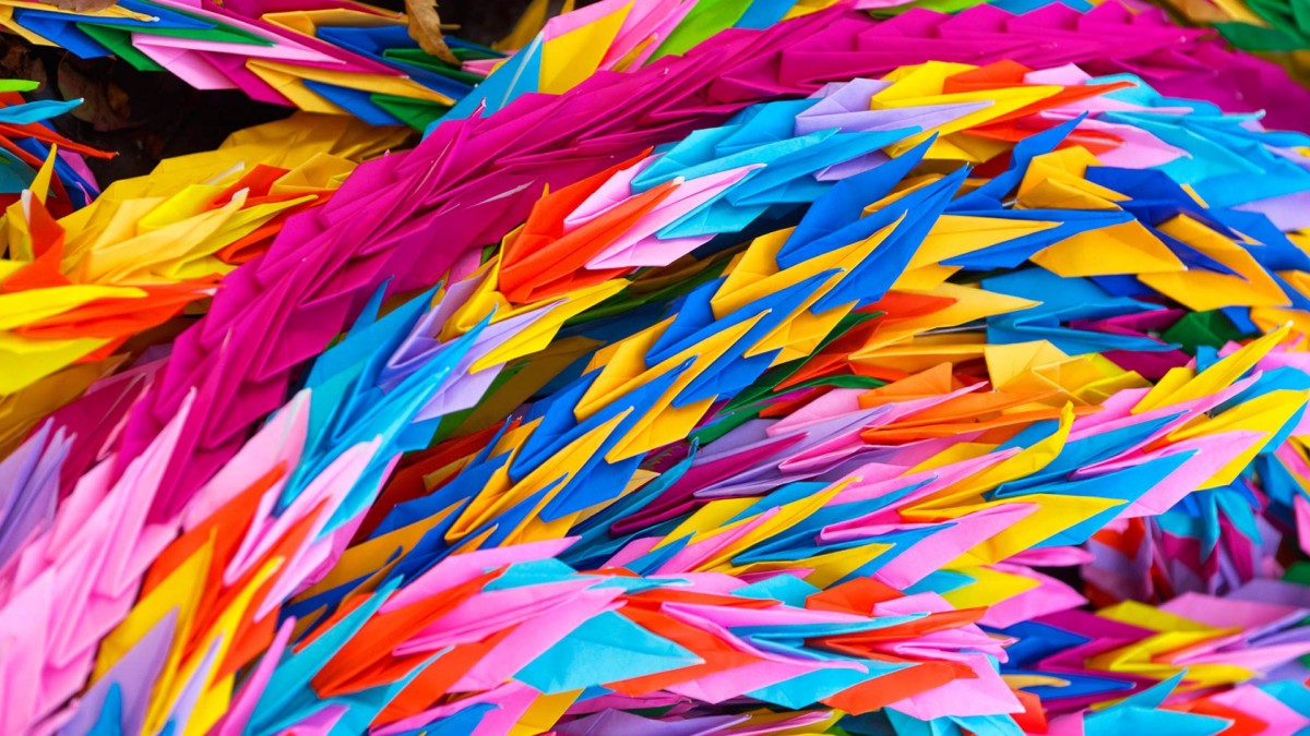 Оригами: множество бумажных журавликов, сложенных вместе.