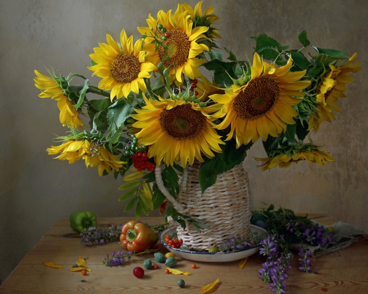 Подсолнухи и рябина в плетеном кувшине на блюдце и болгарский перец. Фотограф Марина Филатова.