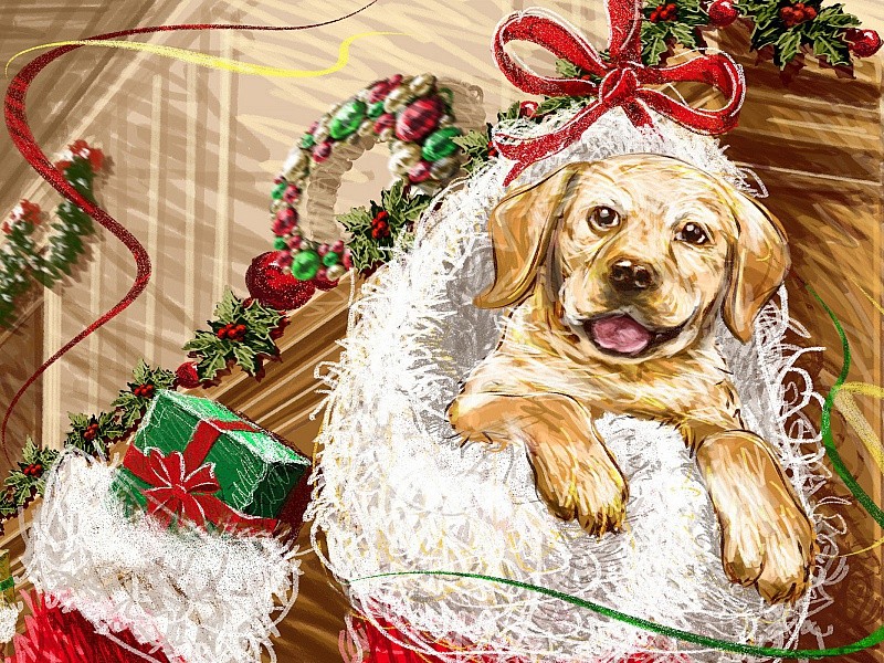Щенок в носке для подарков.