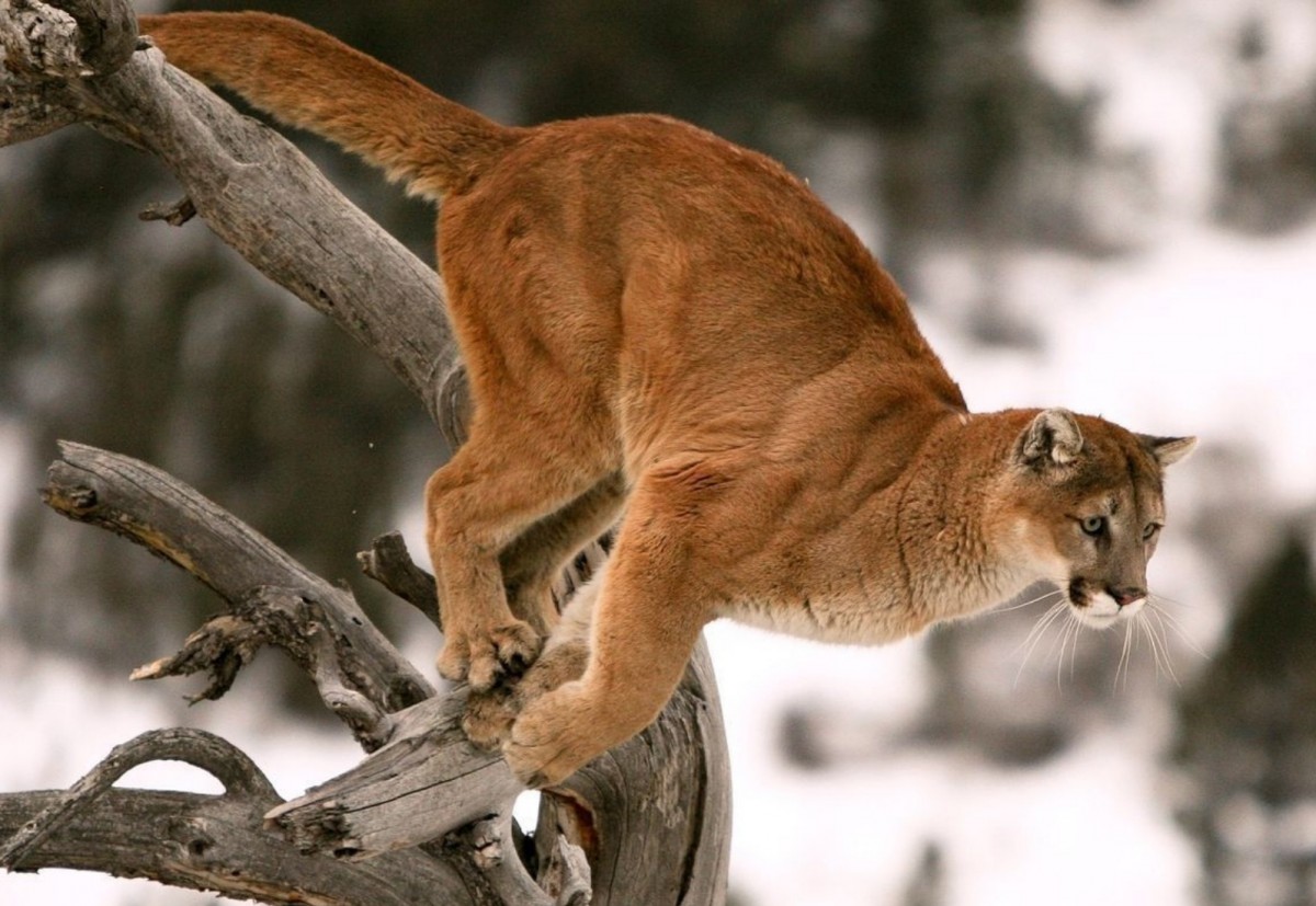 Пума прыгает с дерева.