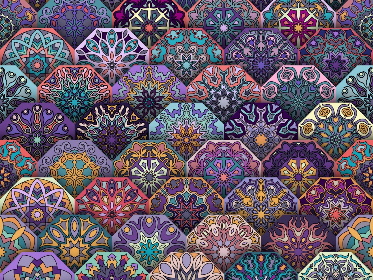Разноцветные шестигранники с узорами.