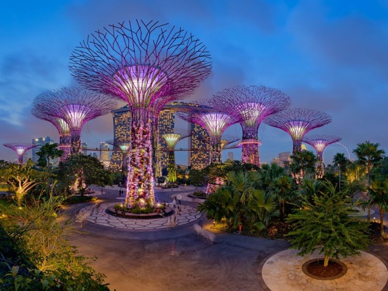 На берегу залива Марина Бэй в центральном районе Сингапура находится удивительный тропический парк Gardens by the Bay ("Сады у залива"). Комплекс "Сады у залива" может похвастаться 225 тысячами растений из различных континентов, водными садами, оранжереями, бассейнами, водопадами, а также необычной аллеей, состоящей из 18-ти исполинских деревьев Supertrees Grove. Необычные сооружения в темное время суток превращаются в светящийся разноцветными огнями лес. Высота огромных древовидных конструкций колеблется от 25 до 50 метров. Они служат приютом для уникальных тропических растений, включая экзотические папоротники, орхидеи и редкие виды лиан. Кроме того, сооруженные из бетона и железных прутьев конструкции имитируют процессы жизнедеятельности деревьев – используют солнечную энергию для некоторых важных функций. Сиять ночью этим фантастическим растениям позволяют аккумулирующие энергию фотоэлектрические панели, которые установлены на некоторых из них. Другие деревья предназначены для кондиционирования оранжерей и сбора дождевой воды, обеспечивающей функционирование фонтанов и орошение. Обвитые тропическими растениями металлические гиганты соединены надземными переходами, с которых очень удобно наслаждаться окружающими пейзажами. Подняться на смотровую площадку, расположенную под кронами двух крупных супер-деревьев можно по пешеходной тропе OCBC Skyway, что на высоте 22 метра, а отдохнуть и подкрепиться посетители могут в кафе Supertree-top, лежащем на 50-метровой высоте. Ночью необычная аллея Supertrees Grove оживает, радуя гостей световым и музыкальным шоу OCBC Garden Rapsody.Однотонные области: 7%