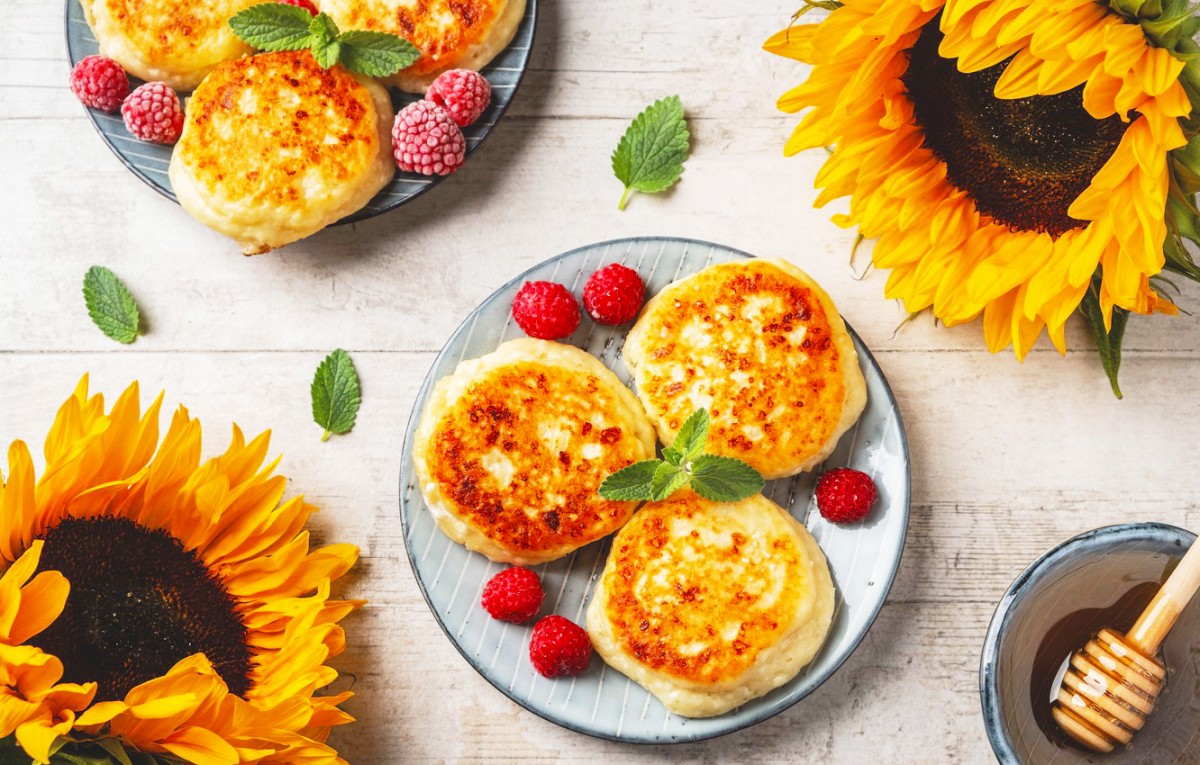 Сырники на тарелке и подсолнухи.