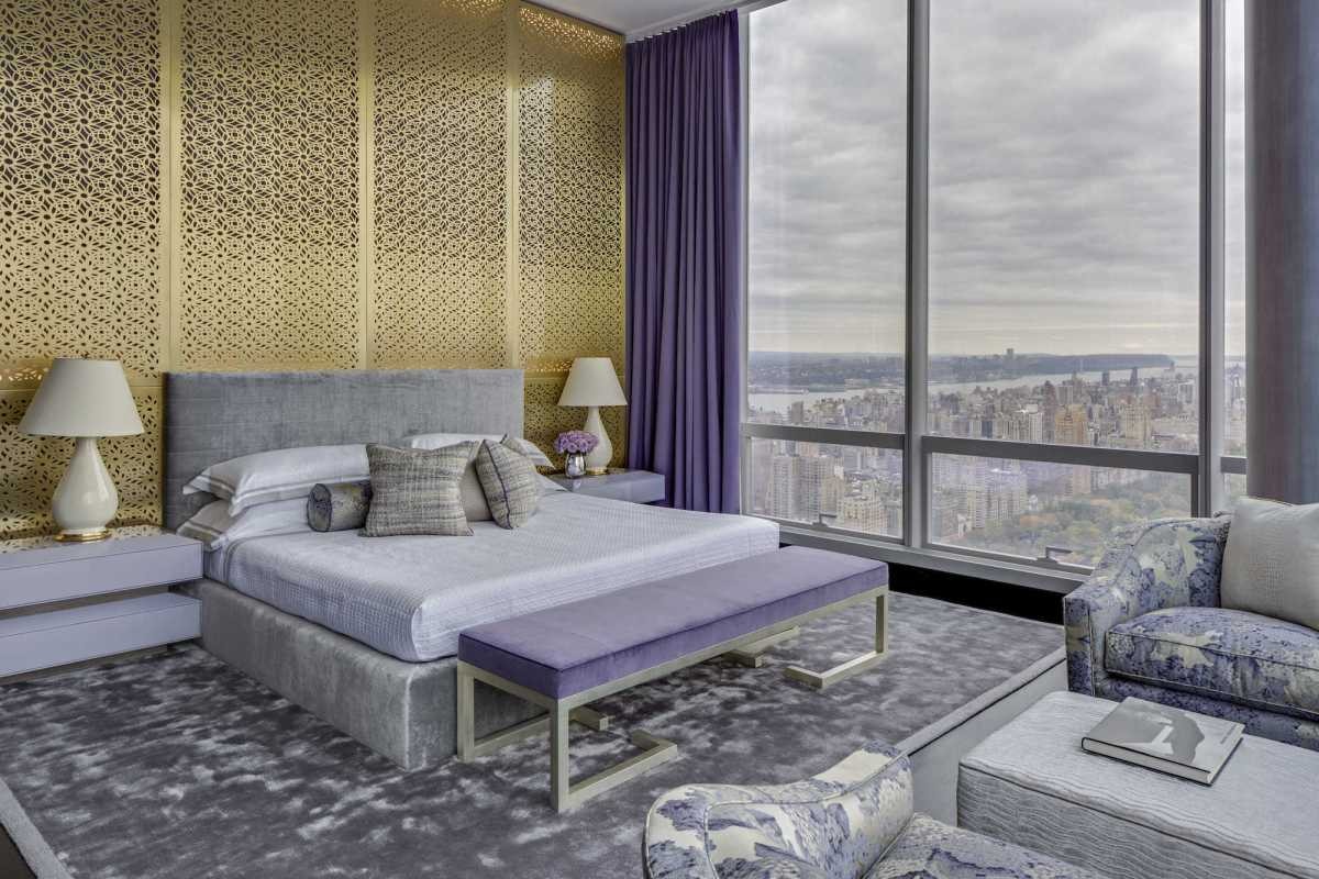 Интерьер спальни с видом на Нью-Йорк.
