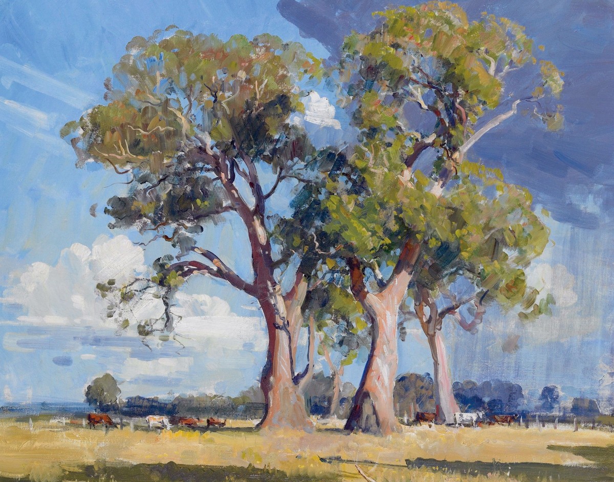 "Три эвкалипта" (The Three Gums)", сэр Артур Эрнест Стритон (англ. Sir Arthur Ernest Streeton; 08.IV.1867 - 01.IX.1943) - австралийский пейзажист, один из крупнейших представителей Гейдельбергской школы, реалистического течения в австралийской живописи конца XIX века.Однотонные области: 2%