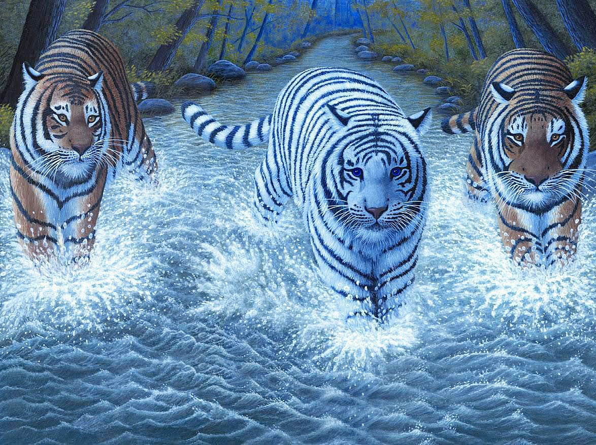 Три тигра стоят в реке.