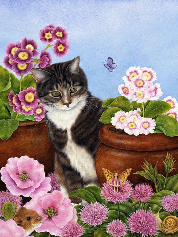 Котик задумался-как он мог оказаться в столь странной компании?Эльф,хомяк и улитка-наверное ему это снится.Спасибо Sakara за интересный пазл